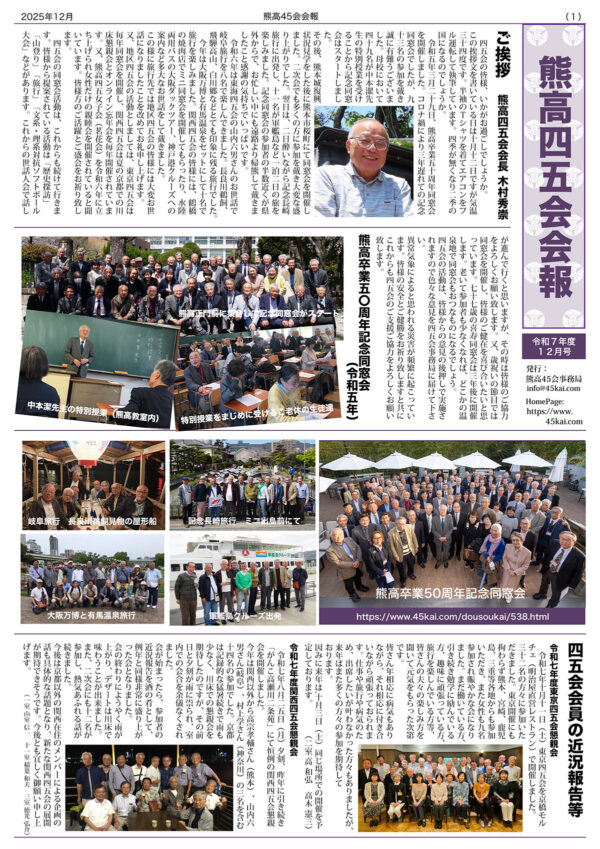 2025年度版「熊高45会会報」を掲載しました。 皆様から寄せられた近況等を掲載した「2025年度版 熊高45会会報」を発行しましたので、以下に掲載します。 ■「熊高45会会報」一括ダウンロード 画像をクリックするとPDFファイルを表示(またはダウンロード)できます。 注)ファイルサイズが大きいので、ページ毎にダウンロードする場合はページ下部の個別リンクからダウンロードしてください。 ■「熊高45会会報」ページ毎にダウンロード